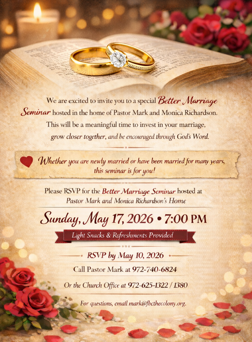 First Baptist Church of The Colony is a local expression of the body of King Jesus. We are: Elder-led, Word-based, Great Commission-focused; and Unwoke. Come find your identity, purpose, and final destiny in King Jesus with us. Join us for our Sunday services!